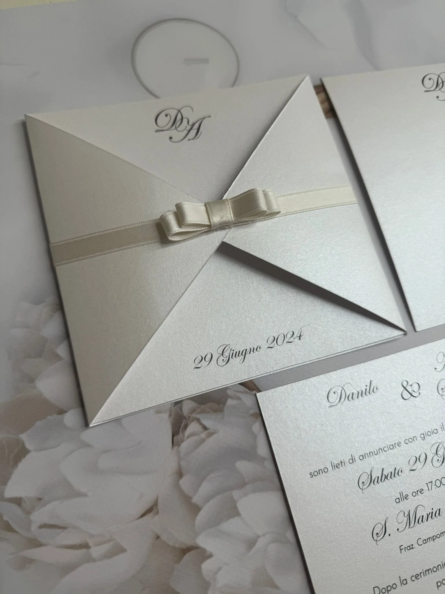 Partecipazione realizzata su carta marble white 300gr con doppio cartoncino