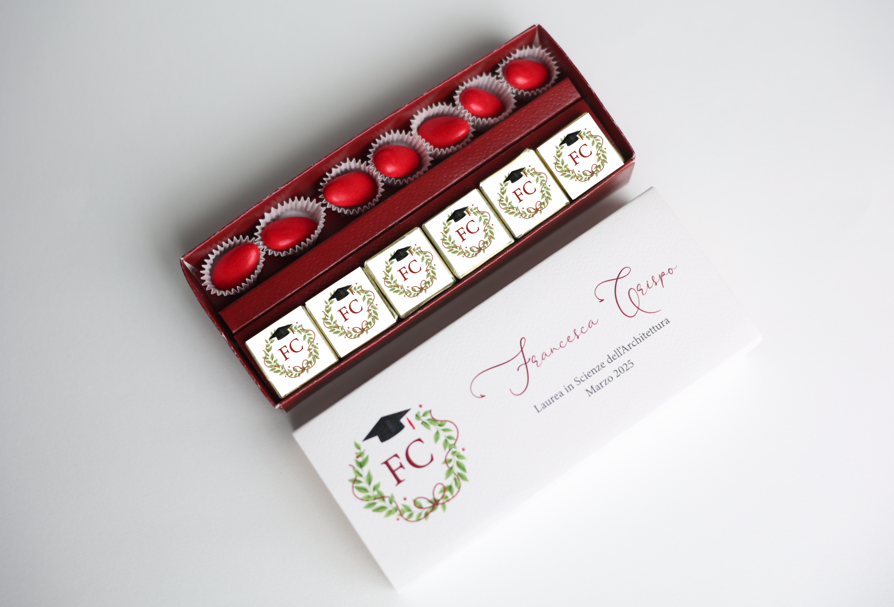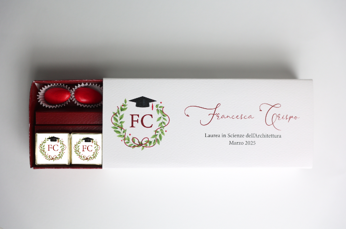 Bellissima box degustazione per contenere confetti e lingottini di cioccolato e chiusa con nastro chiffon seta sfrangiato
