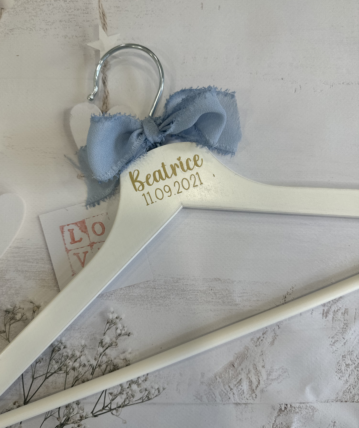 Bellissima gruccia personalizzata in legno bianco.