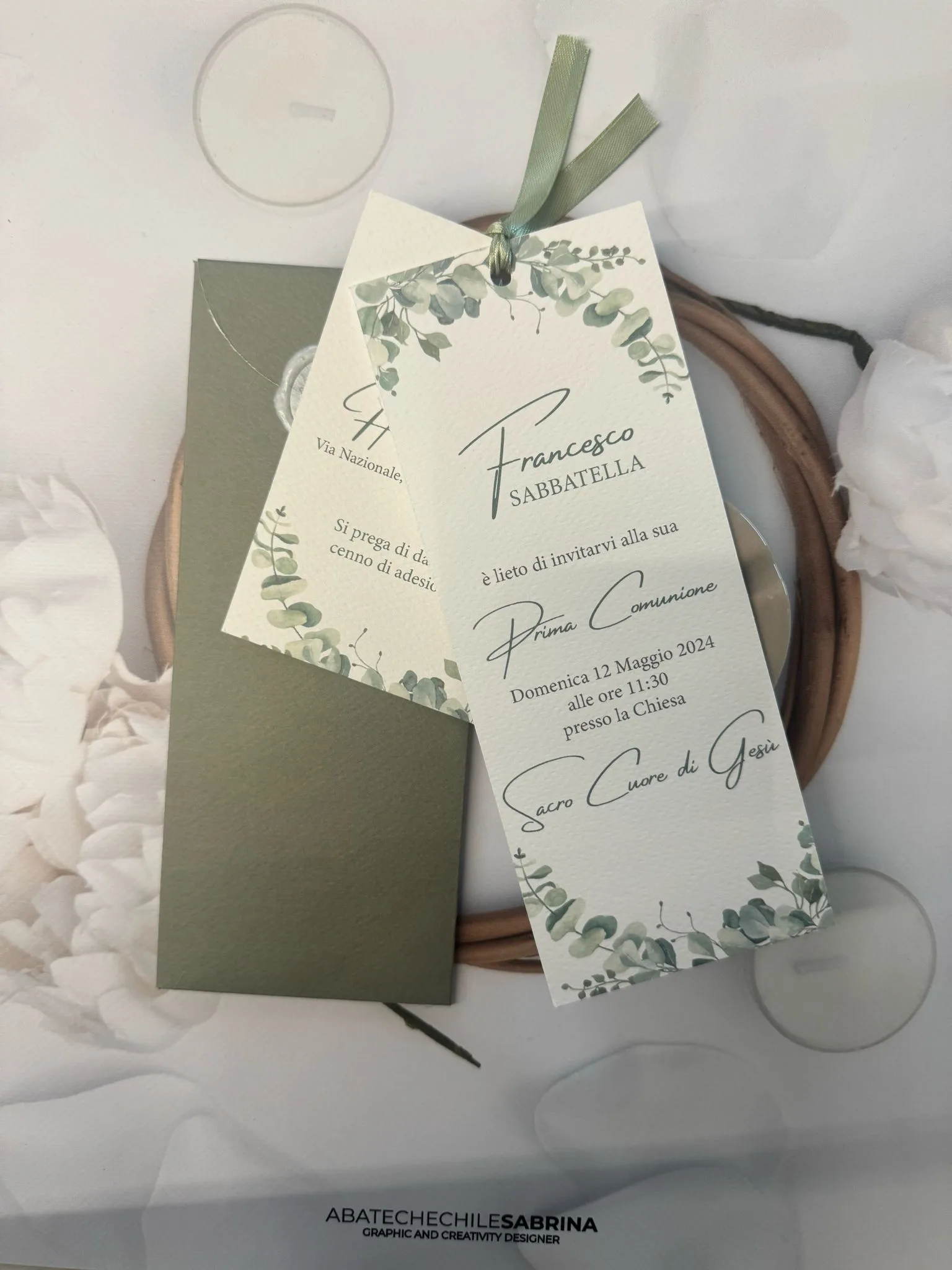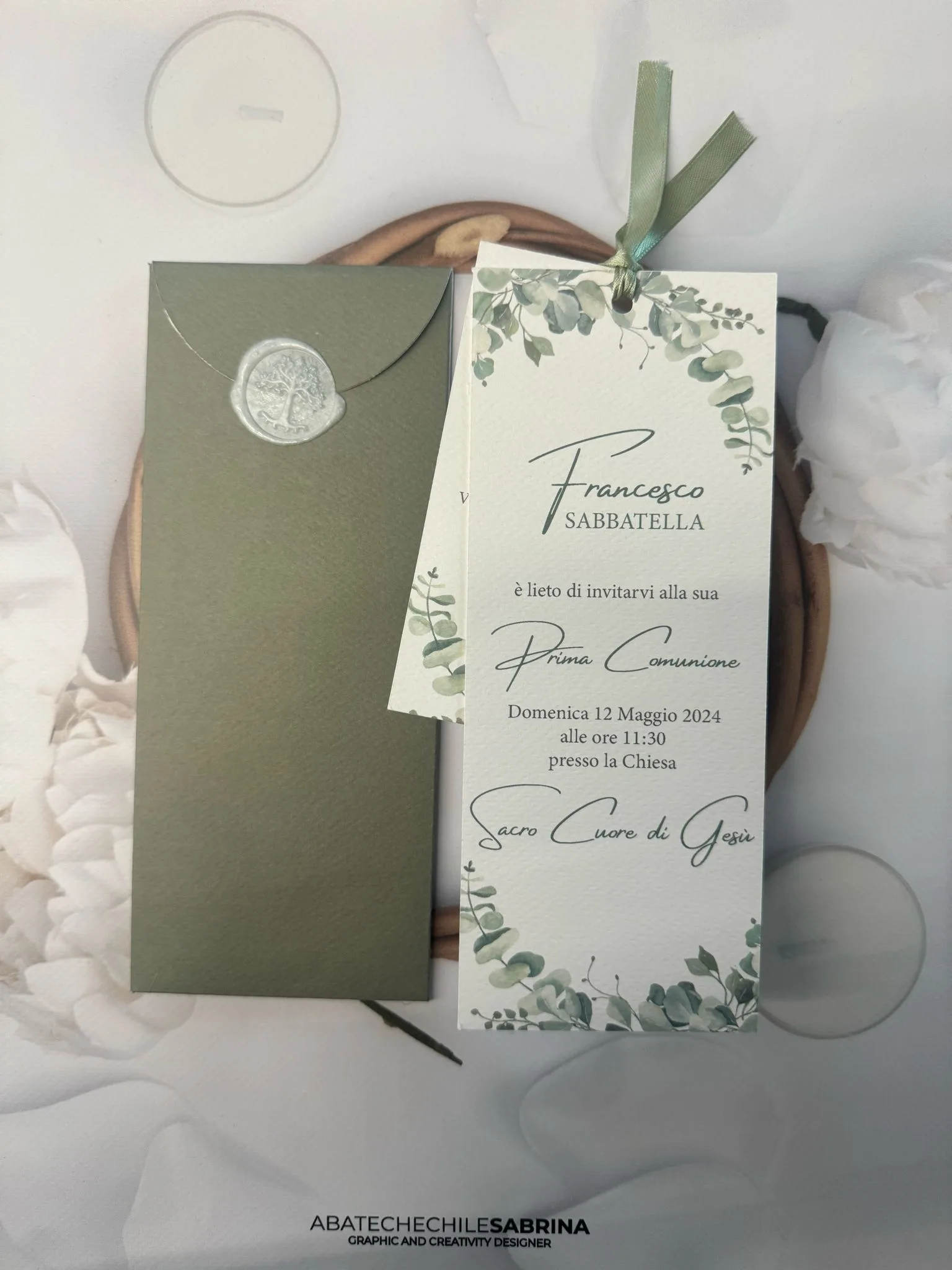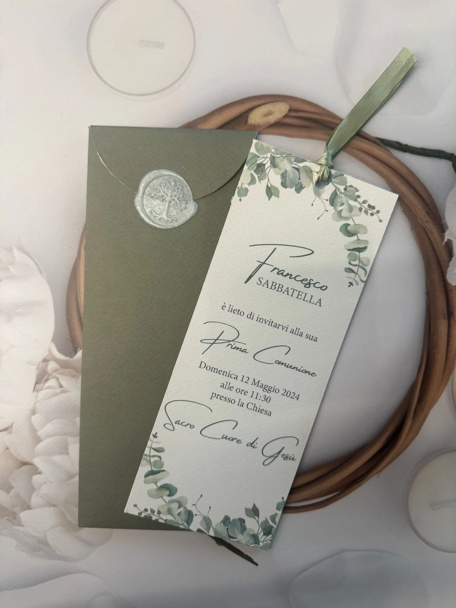 Partecipazione Comunione realizzata su carta Prisma White 300gr con chiusura in ceralacca e nastro seta. Doppio cartoncino e busta stampata e fustellata.