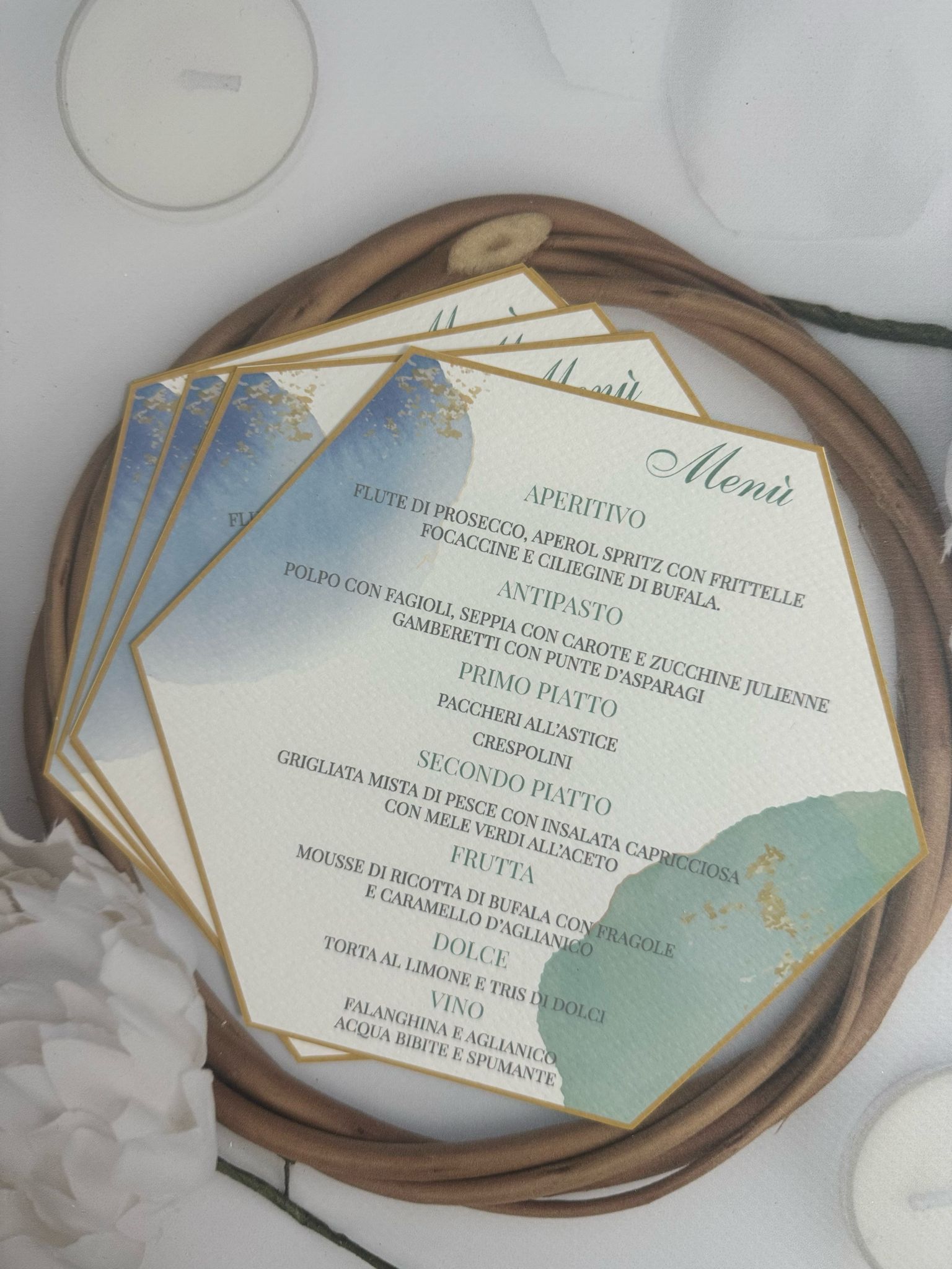 Menù esagonale realizzato con carta Prisma White 300gr.