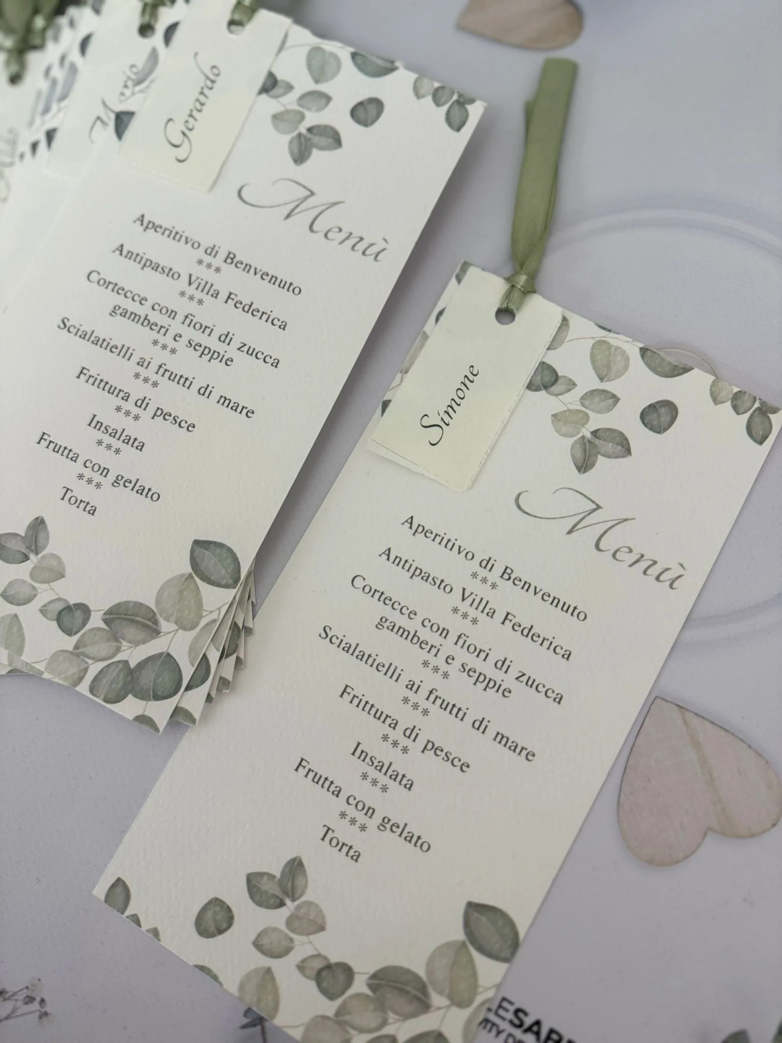 Menù singolo a persona realizzato su carta prisma white 300gr con tag segnaposto in carta d’amalfi il tutto chiuso con nastro in seta.