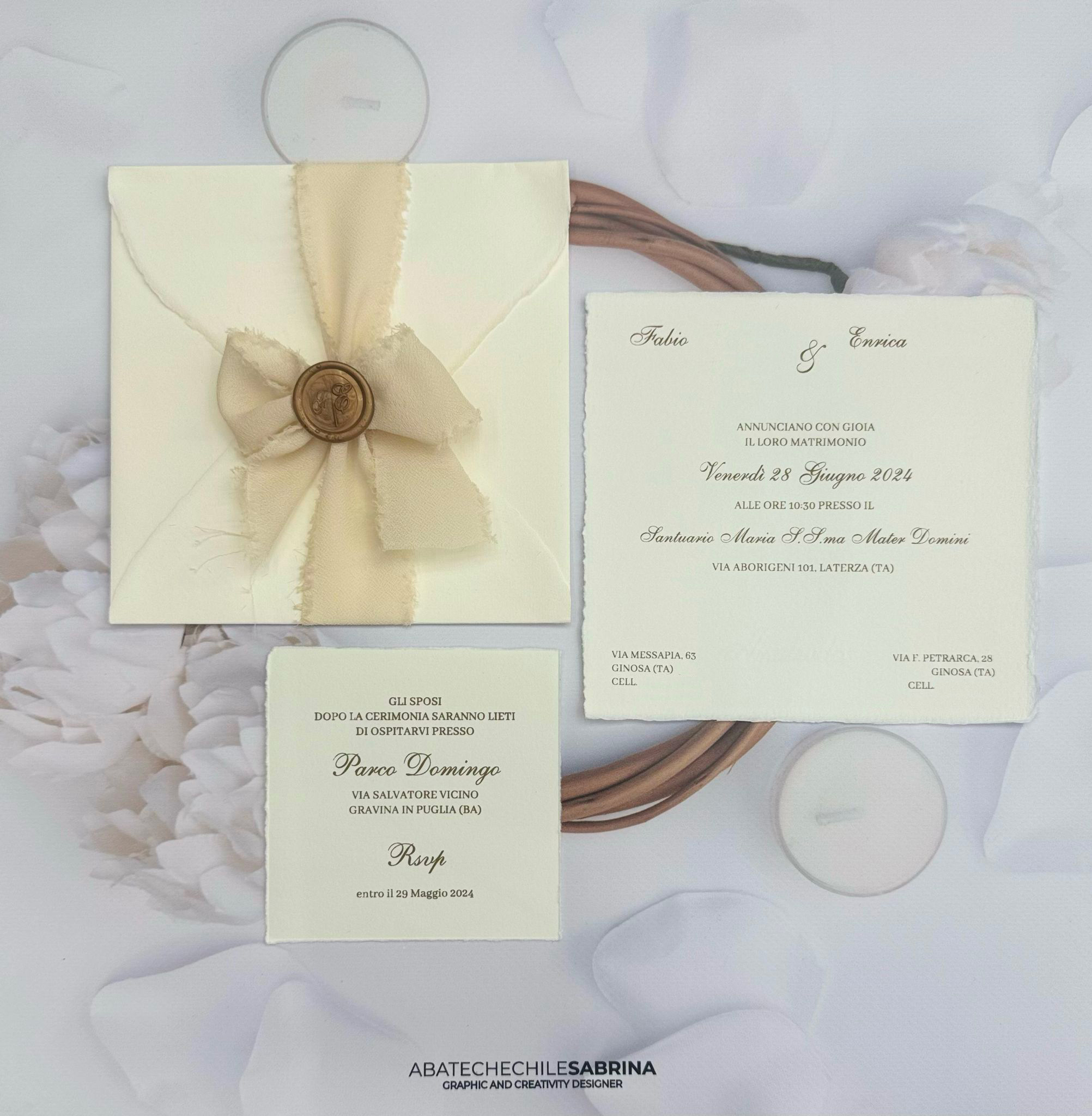 Partecipazione in carta d’Amalfi con stampa oro serigrafica.