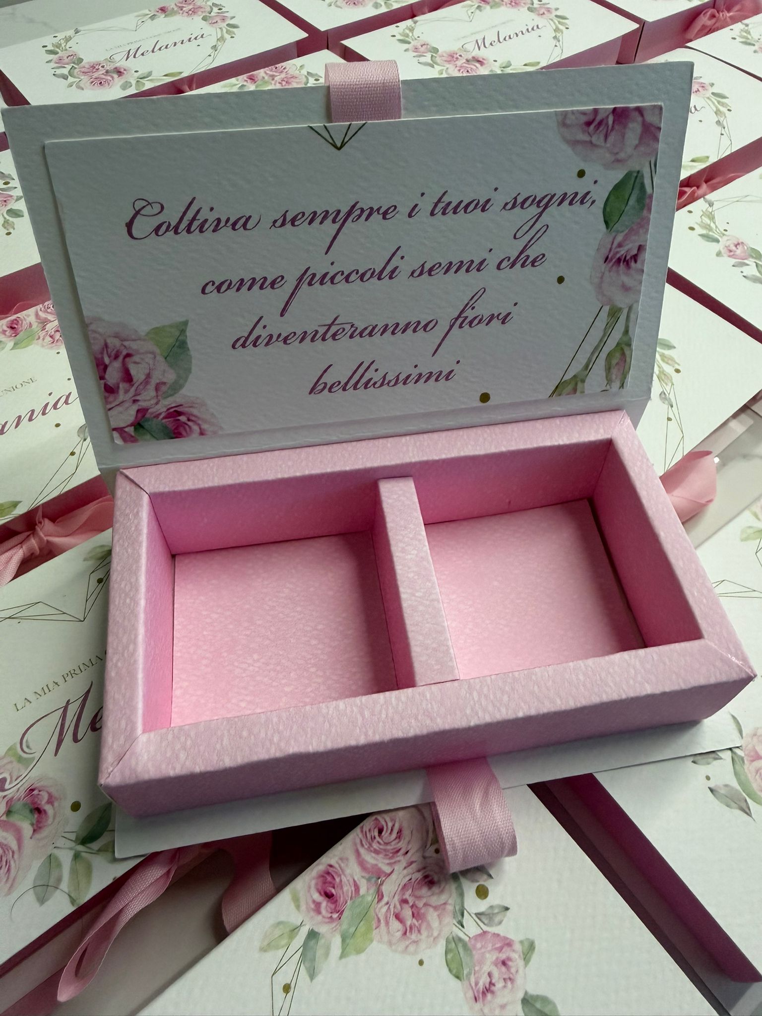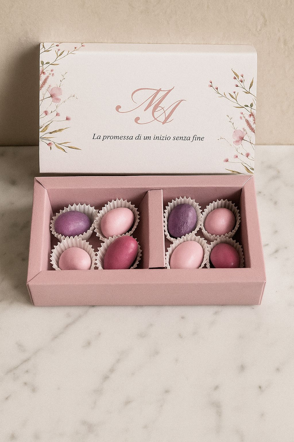Il modello Petalo non è una semplice scatola, ma una vera e propria bomboniera-gioiello che incapsula la dolcezza del vostro giorno.