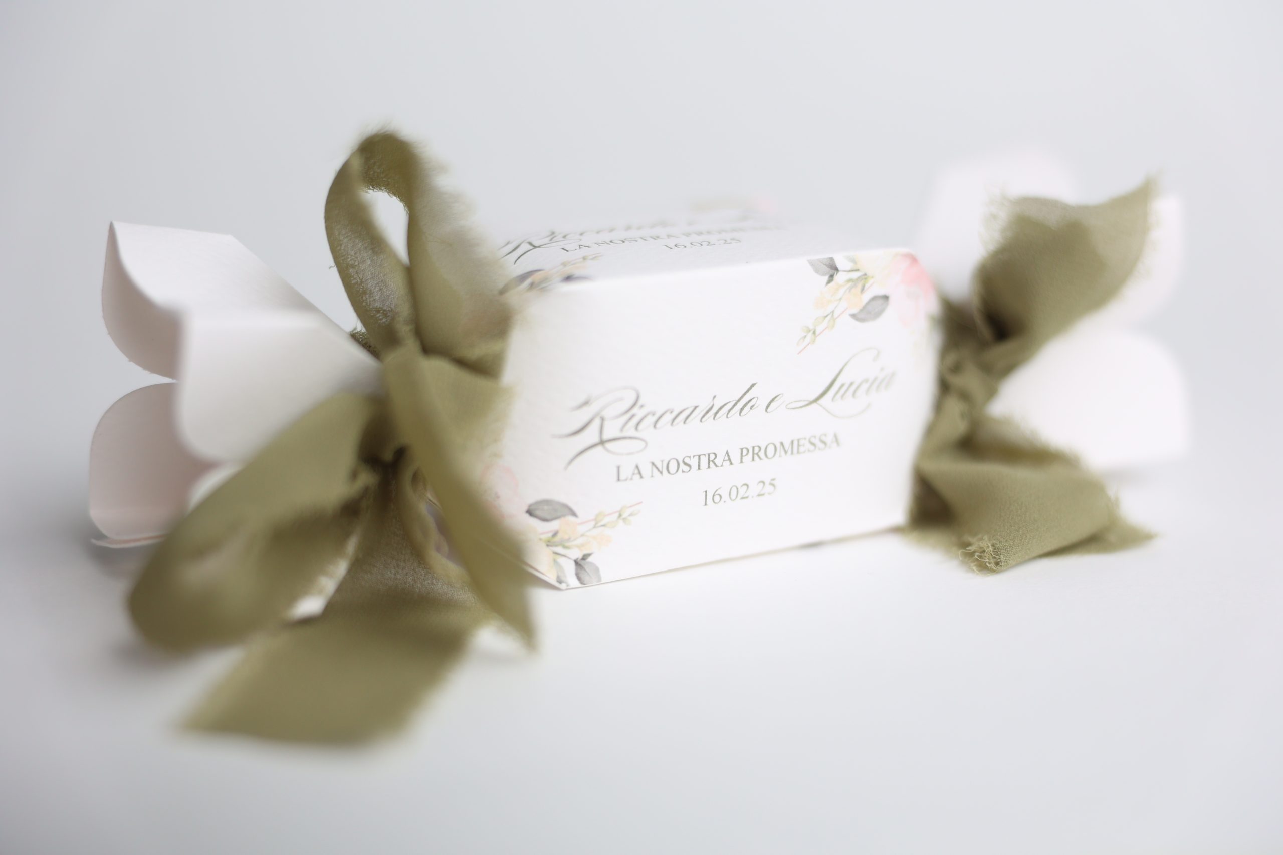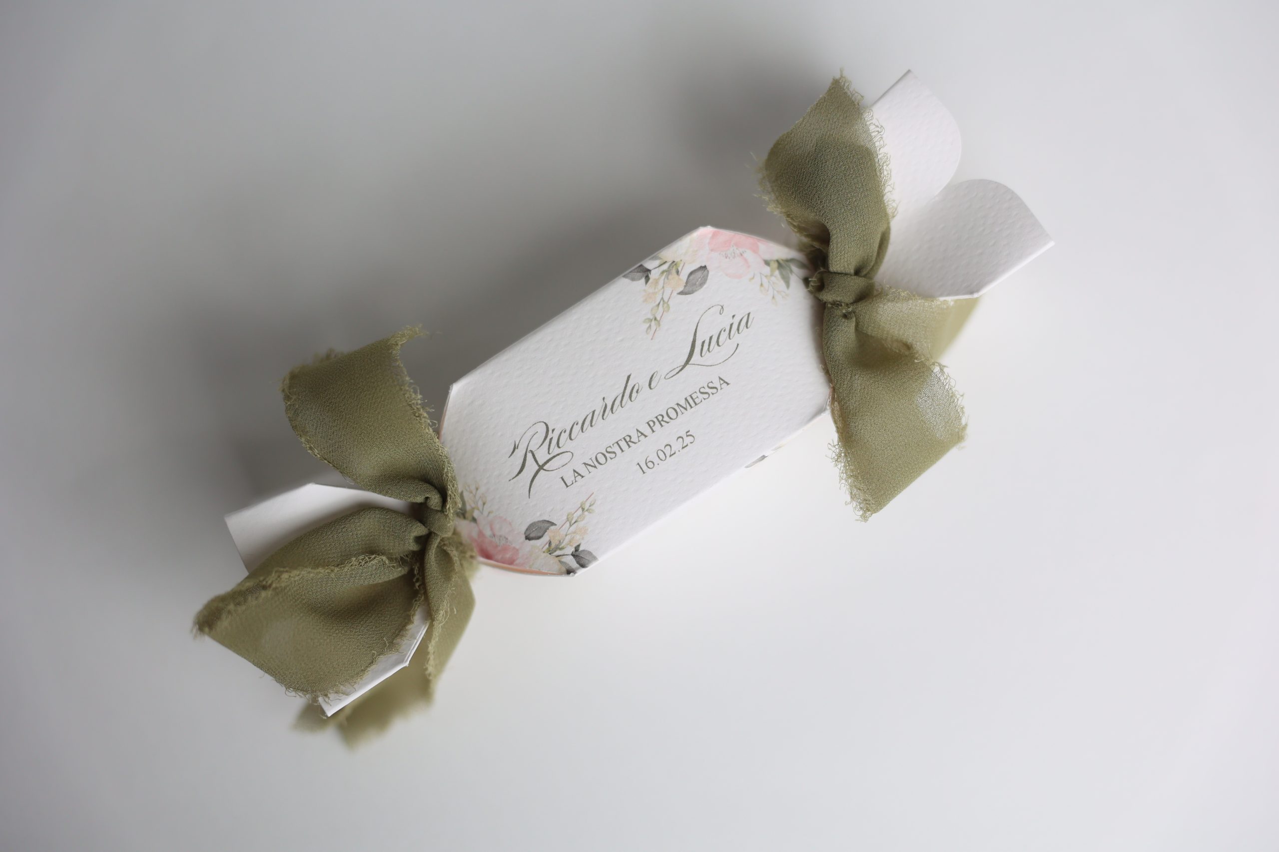 Scatola caramella chiusa con nastro chiffon sfrangiato