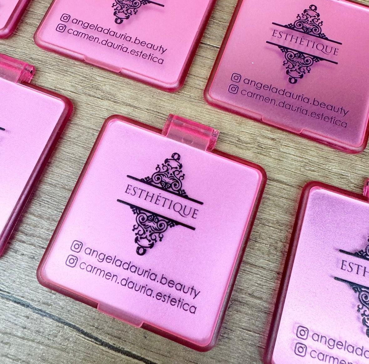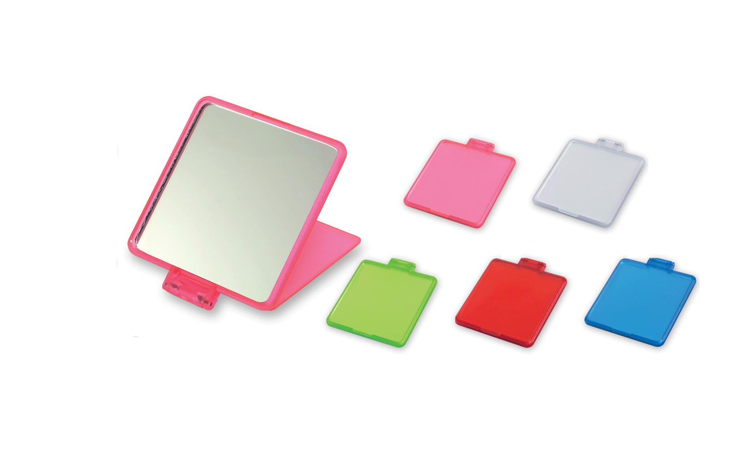 Specchietto con coperchio utilizzabile come piedino di sostegno in plastica.
