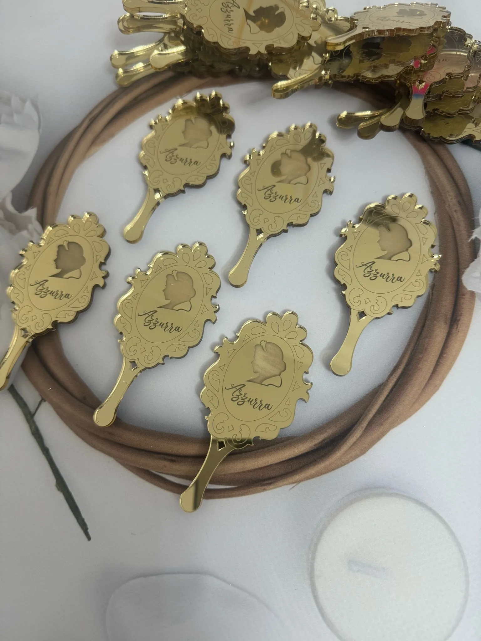 Idea bomboniera o segnaposto specchietto biancaneve in plexiglass con calamita sul retro.