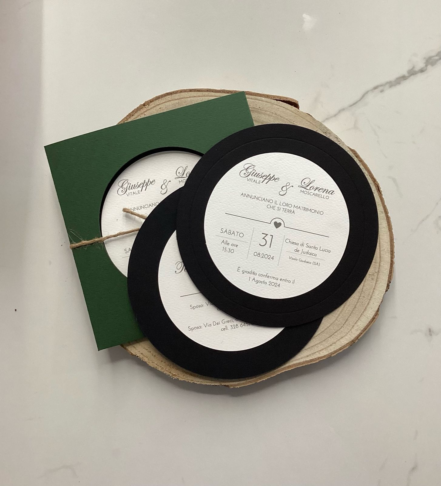 Partecipazione: realizzata con carta Prisma White 300gr e Fabriano Murillo black