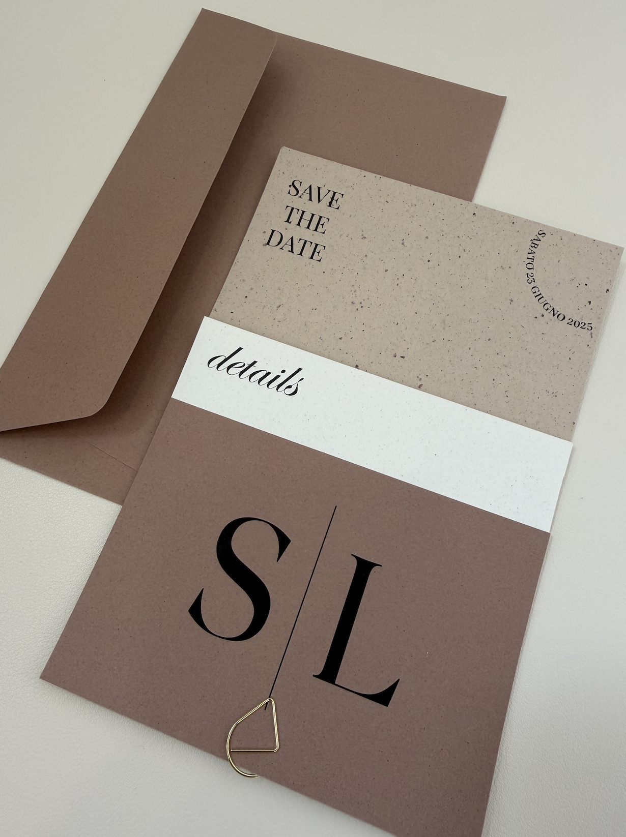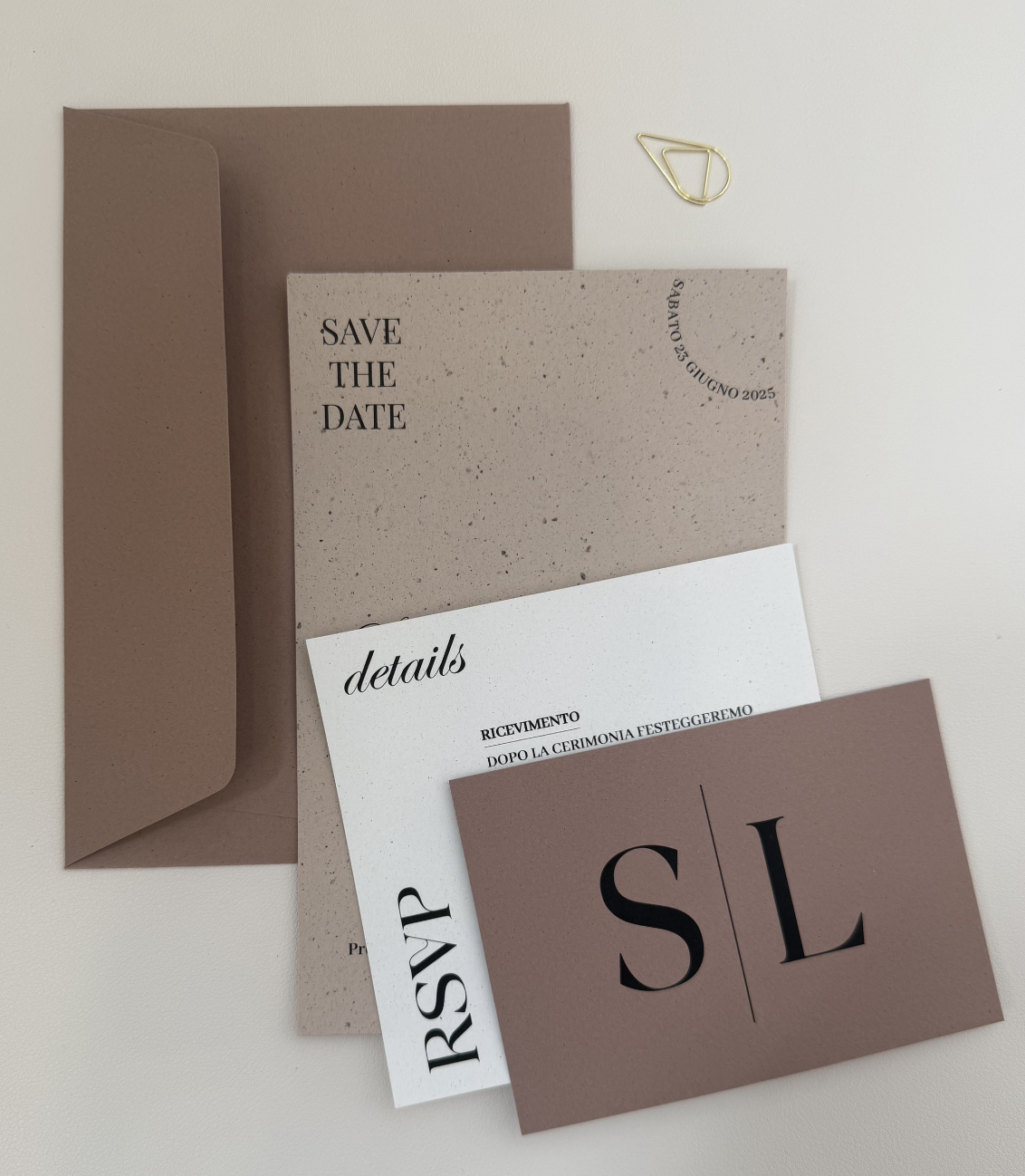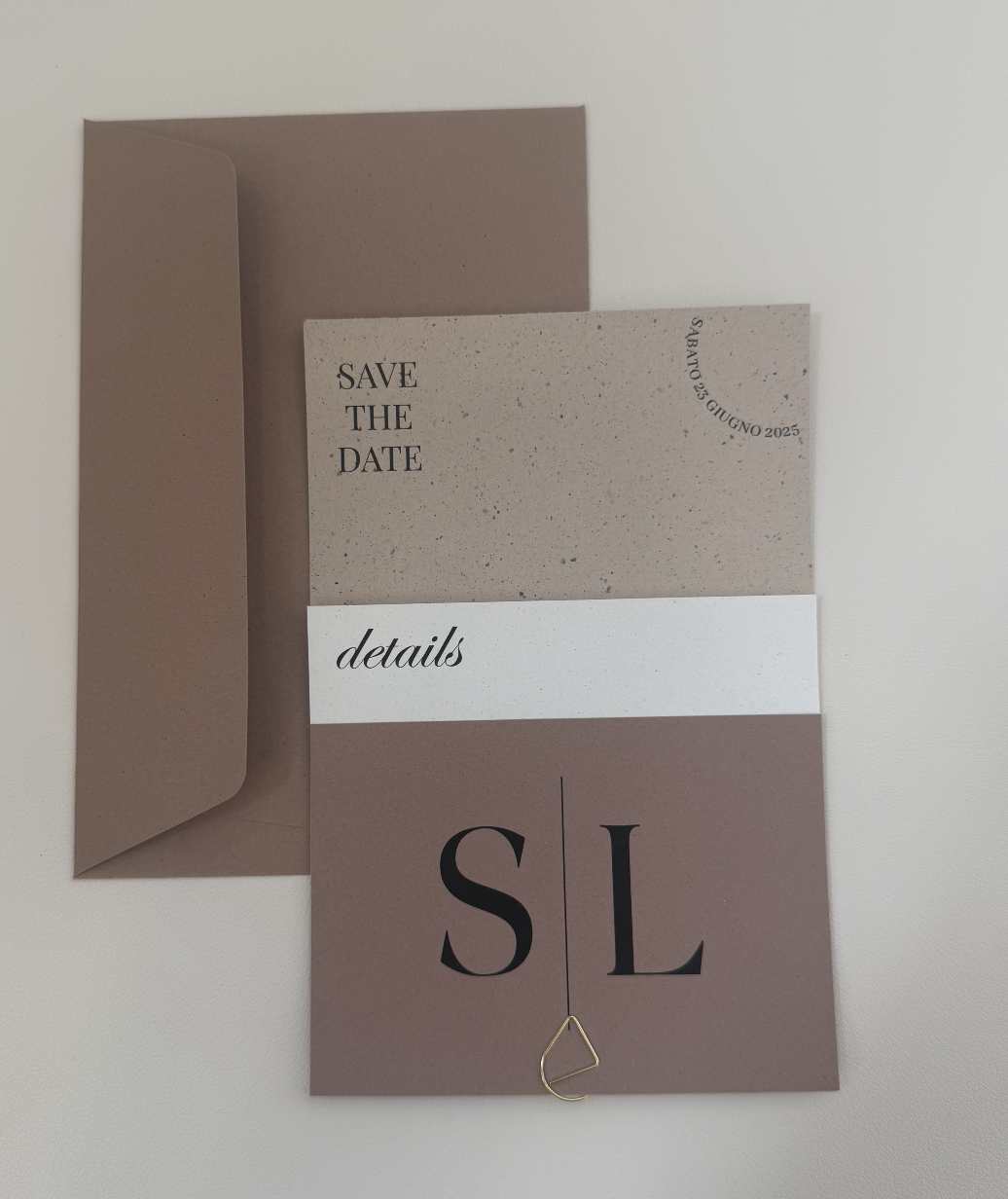 L’invito TERRA combina un design moderno con una palette di colori calda e sofisticata, perfetta per coppie che desiderano uno stile chic ma non convenzionale.